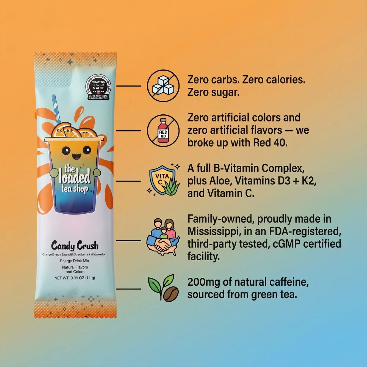 - 0 Calories • 0 Carbs • 0 Sugar • 200mg Caffeine
